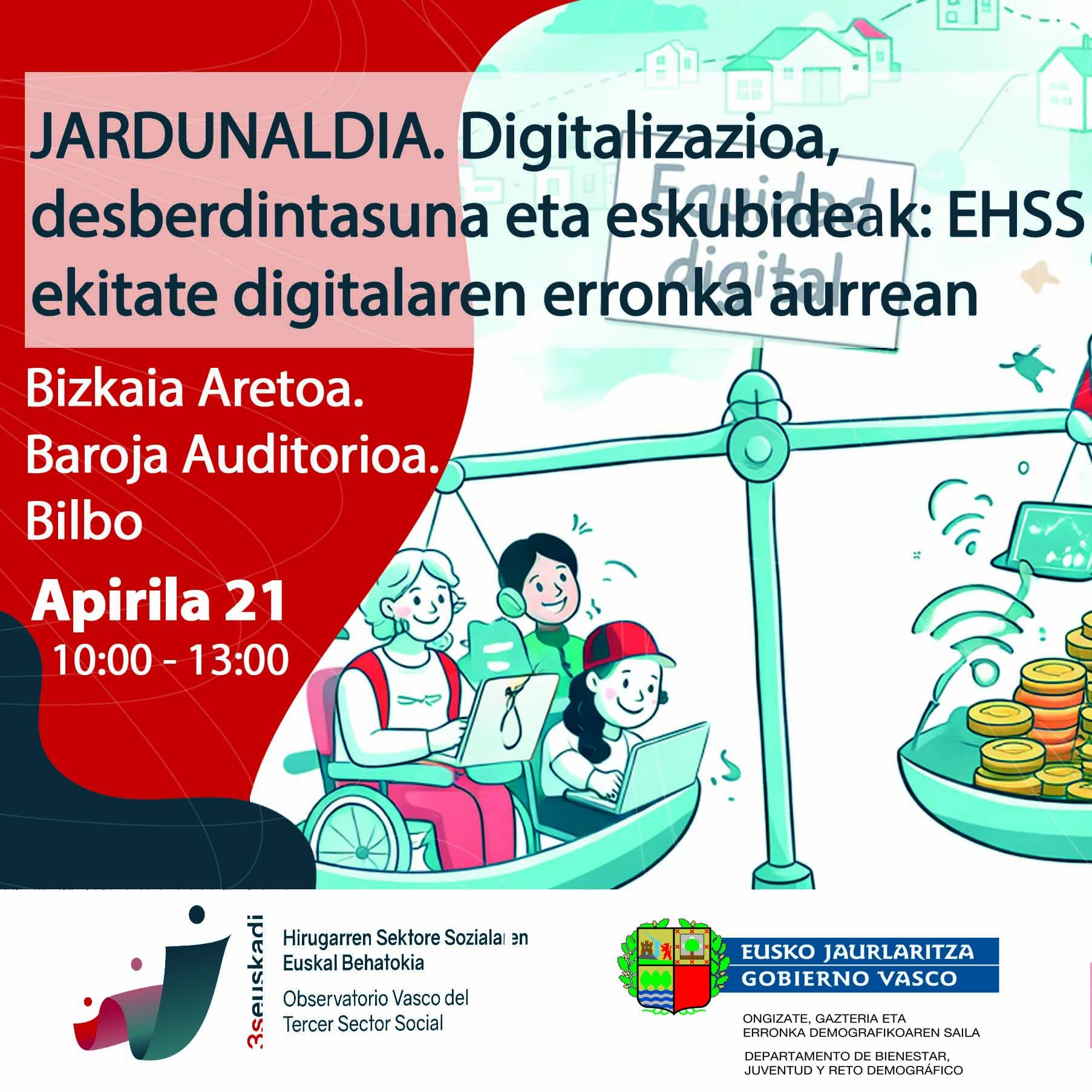 Horrela, eskubide digitalak Estatu sozialaren funtsezko eremu gisa eratzen dira, inklusio digitala, datuen babesa, irisgarritasuna, diskriminazio algoritmikorik eza edo adimen artifiziala bezalako teknologien erabilera etikoa bezalako gaiak txertatuz. Erronka horien konplexutasuna ikusita, jardunaldia Hirugarren Sektore Sozialaren eta eskubide digitalen artean partekatutako hausnarketarako gune gisa planteatzen da, haren dimentsio soziala ikusaraztera, digitalizazioaren erronka nagusiei heltzera eta EHSSk eremu horretan dituen esperientziak partekatzera bideratuta.